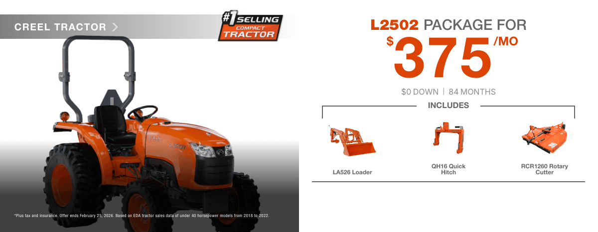 If you're looking for quality equipment and exceptional services provided by trained experts, you've come to the right place. At Creel Tractor Company, we pride ourselves on matching each customer's unique needs with the Kubota that will serve them best. We're glad you're here, where you can check out our inventory, order parts, schedule a service appointment or simply give us a call to let us know how we can help you.